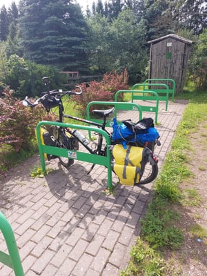Während der Nacht habe ich Halsweh und Schnupfen bekommen. Vorallem bergauf hatte ich Mühe. Die Strecke, die ich heute gefahren bin, folgte fast ausschliesslich der Green Velo. Dieser Fahrradweg führt durch weite Teile Polens.Teil war die Route geteert, teils waren es Naturstrassen, die bis auf wenige Kilometer gut zu befahren waren. Alle 10-20km kommt eine überdachte Sitzgelegenheit und ein WC.